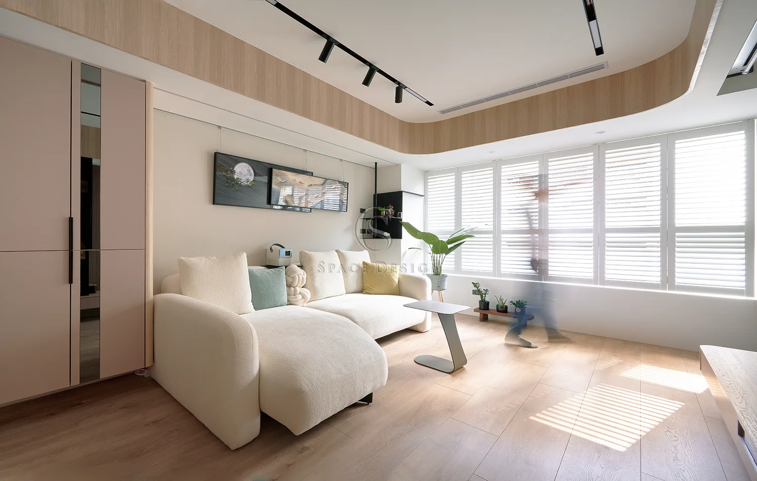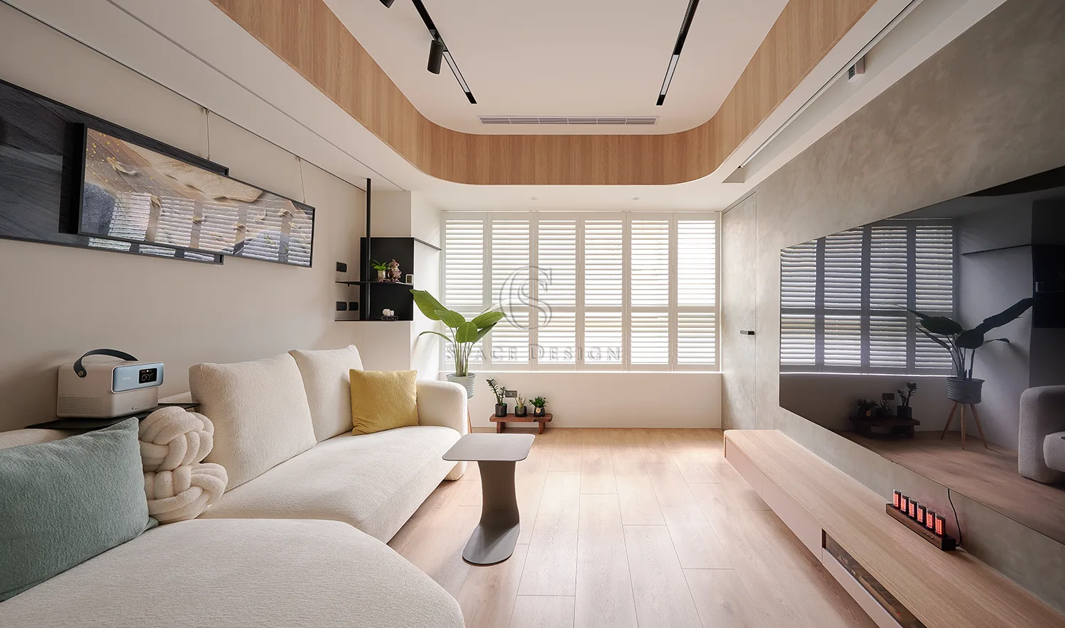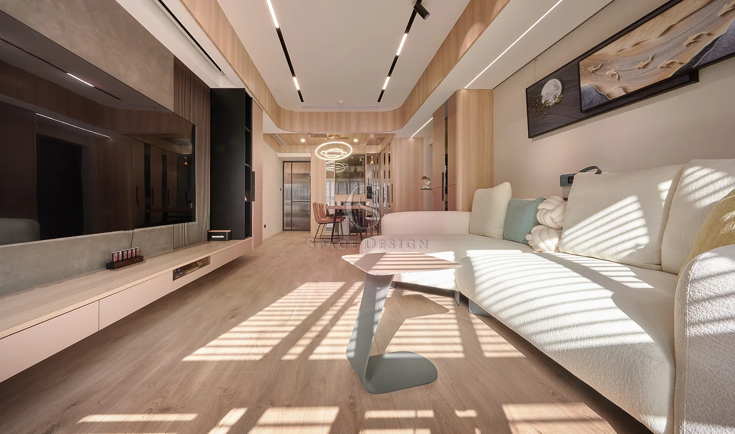 藉由低光澤、淺色調的材料語彙,與柔化反射的鏡面,共同構築出安靜的基底。整體不為追求戲劇化或者華麗的場景,而是藉此賦予能長期乘載家庭各項生活模式的框架。作品讓「光」成為核心語言,使都市住宅成為能調節節奏、修復情緒的生活場域。