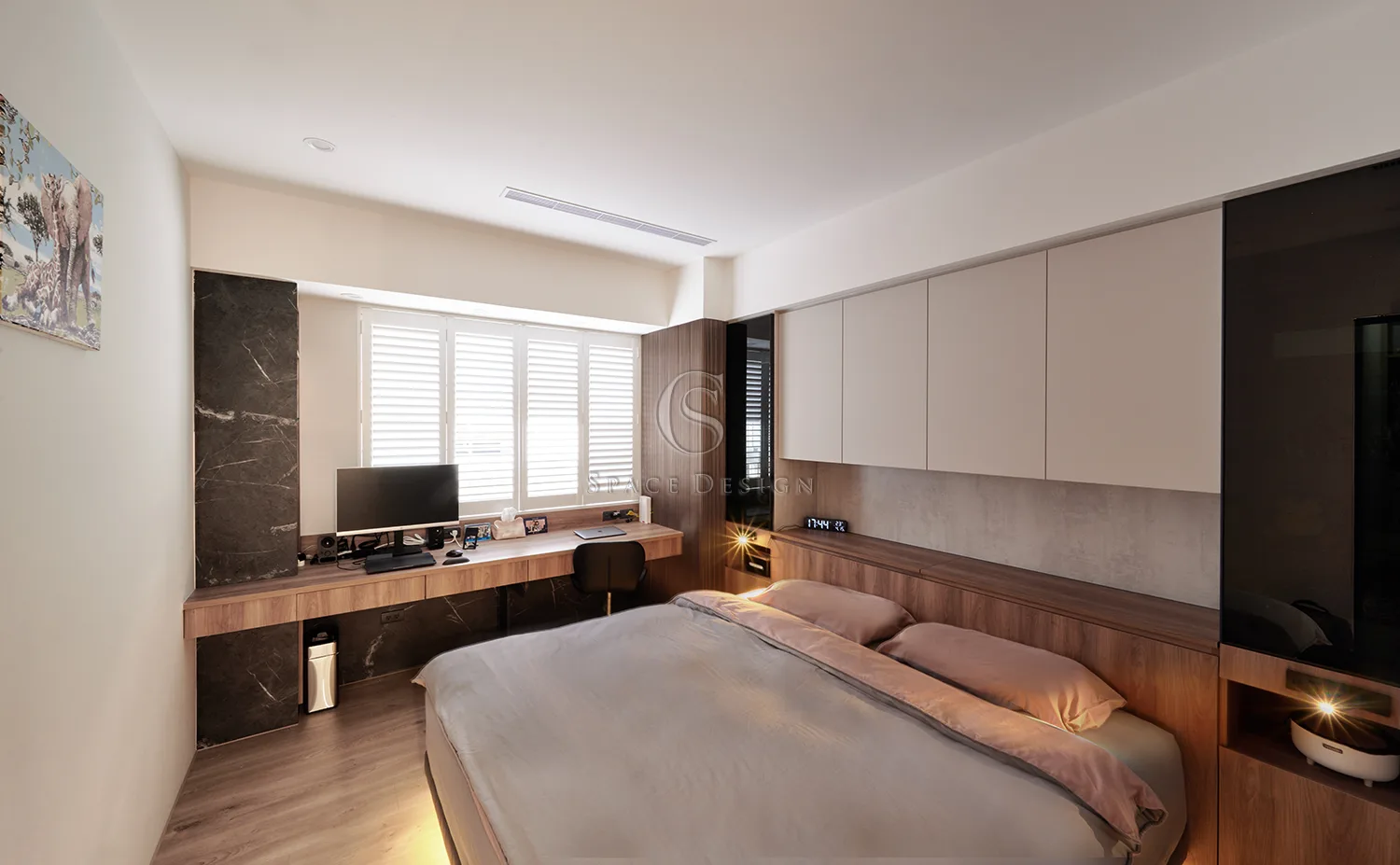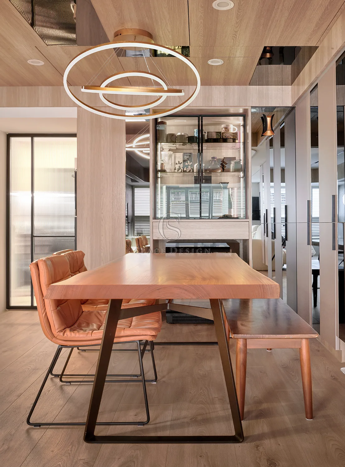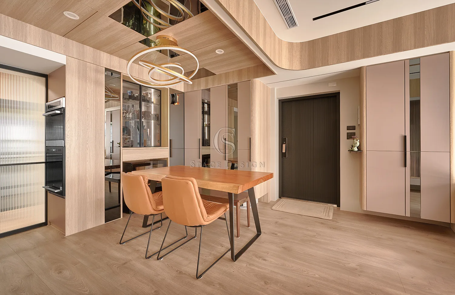 天花的弧度柔化了原本的生硬線條,使光與空氣沿著曲面流動,為室內注入呼吸感。餐桌前的鏡面不只是延展視覺,也折射出交流時的溫度,讓聚會多了一層凝聚。百葉如同光的節奏器,隨角度調整,將明亮與靜謐轉換成不同氛圍。這些看似低調的設計,卻在無形中改變了日常感知,讓生活在光影的流轉裡獲得心理平衡。